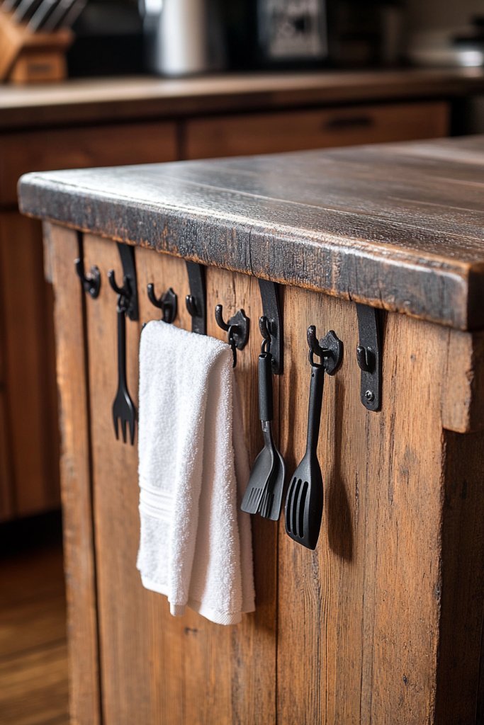 Tired of digging through drawers for utensils or towels? Hooks and pegs provide instant access and keep your workspace tidy. The challenge is choosing fixtures that blend seamlessly into rustic decor without looking cluttered. If you love a practical yet charming solution, adding hooks turns your island into a functional art piece. It’s all about smart storage with style.