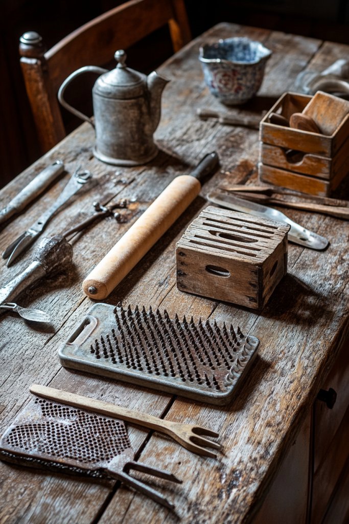 Visualize a set of vintage rolling pins, copper molds, or cast iron skillets hanging on a reclaimed wood wall or displayed on open shelves. Rustic signs, wooden crates, and woven textiles complement these items, creating a cozy, lived-in atmosphere. The aged patina of antique tools adds depth and authenticity, while their varied shapes and sizes make the space lively and interesting. Every piece contributes to a timeless, inviting aesthetic.