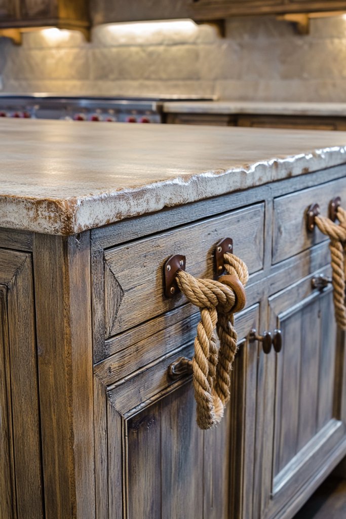 Looking to add a handcrafted, natural element to your rustic island? Rope or leather straps as handles provide an organic, tactile feel that enhances the overall aesthetic. The challenge is choosing materials that are durable yet complement the rustic vibe. If you love the look of simple, earthy details, these handles are both practical and charming. They make everyday use feel special.