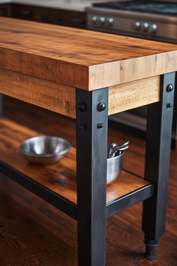 Imagine a wooden island topped with a matte finish, accented by black steel brackets and pipe fittings. Steel legs or support beams add a sturdy, industrial feel, contrasting with the organic texture of the wood. The combination of dark metals with the warm wood creates a striking visual balance. This style often features exposed bolts, rivets, or metal mesh elements that add a rugged, raw character. The result is an eye-catching piece that feels both functional and artistic.