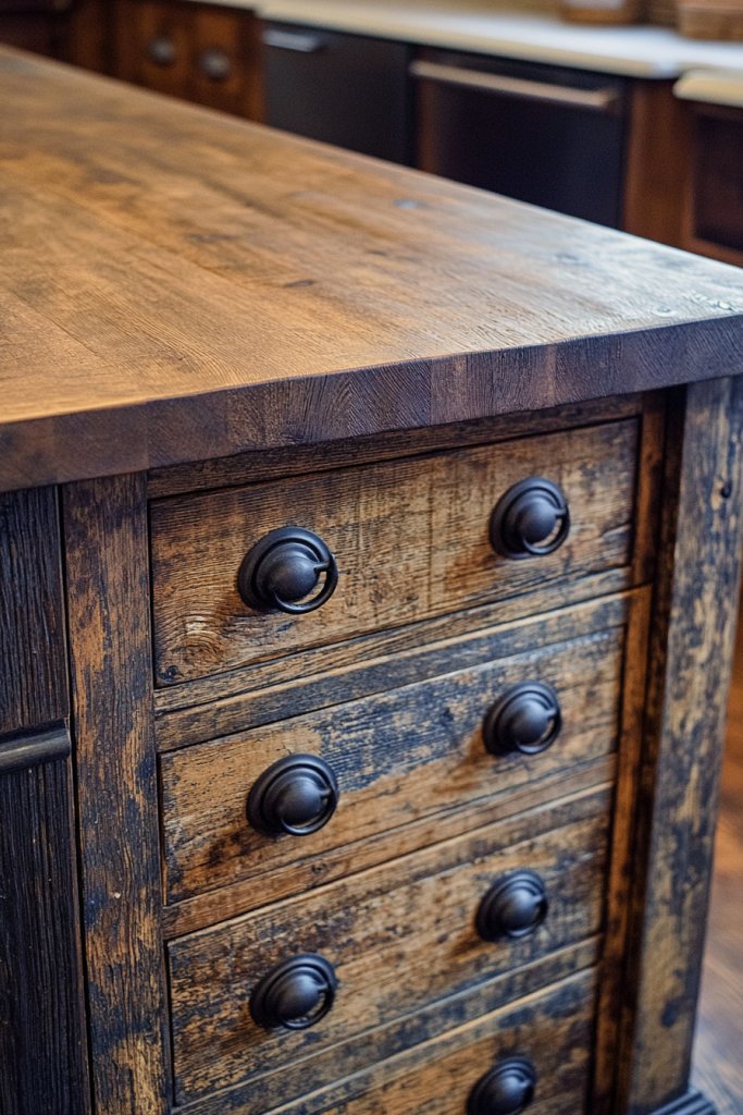 Choose hardware finishes that match your style—oil-rubbed bronze, matte black, or aged nickel. For a more eclectic vibe, mix and match different vintage pulls. You can also customize drawer fronts with stenciled patterns or painted details. If space is tight, opt for shallow drawers or slim profiles that still hold plenty of essentials. Larger islands can incorporate multiple drawers for different categories.