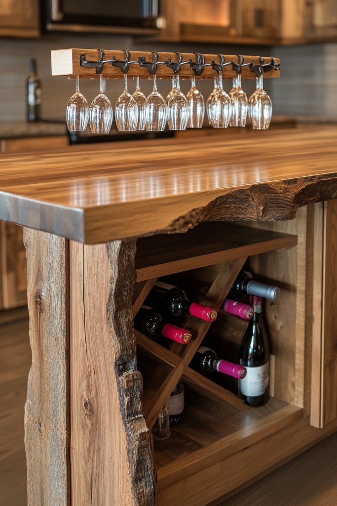 Imagine a narrow, vertical wine rack built into the side of your island, crafted from reclaimed wood or blackened steel. It holds bottles securely, with space for a few favorite vintages. Nearby, hanging glass holders with etched or vintage-style glassware add visual interest. The combination of wood and metal creates a warm, inviting feel. When you entertain, these features become a focal point that’s both functional and decorative.