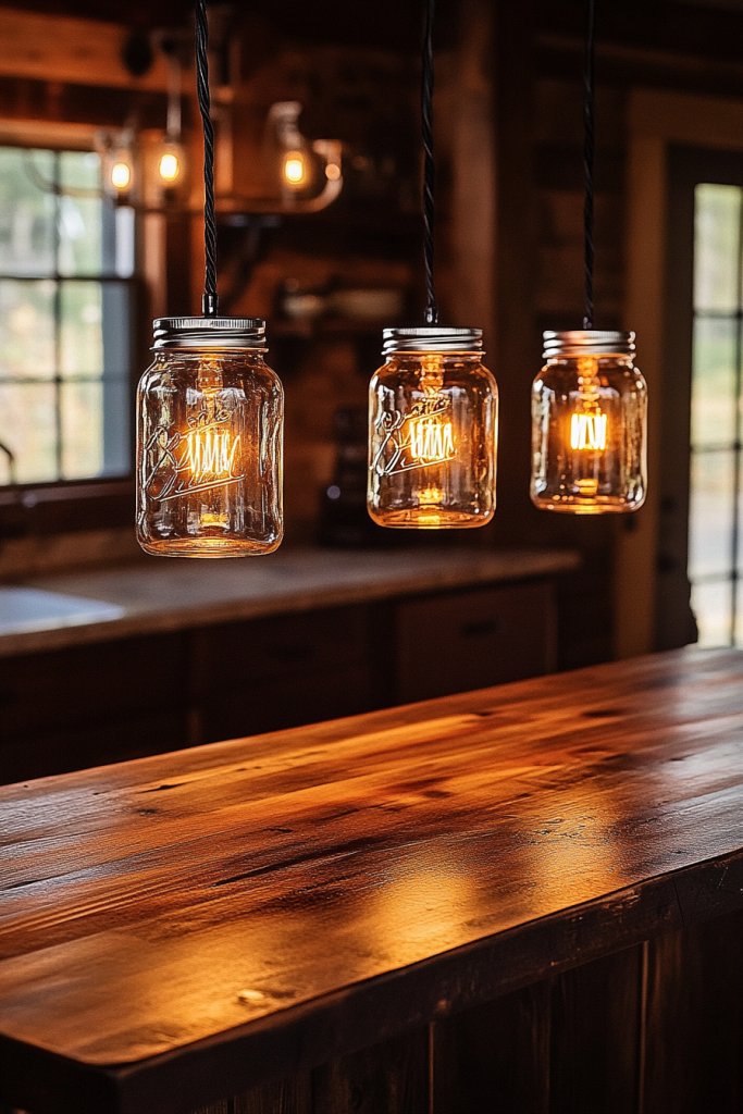 Picture a row of clear or tinted mason jars hanging from blackened metal or distressed wood beams, each fitted with a vintage-style filament bulb. The jars emit a soft, diffused glow that bathes the island in warm light. The textured glass adds an element of handcrafted charm, while the exposed wiring and simple hooks enhance the rustic feel. During the evening, this setup provides cozy, inviting illumination that’s both functional and decorative.