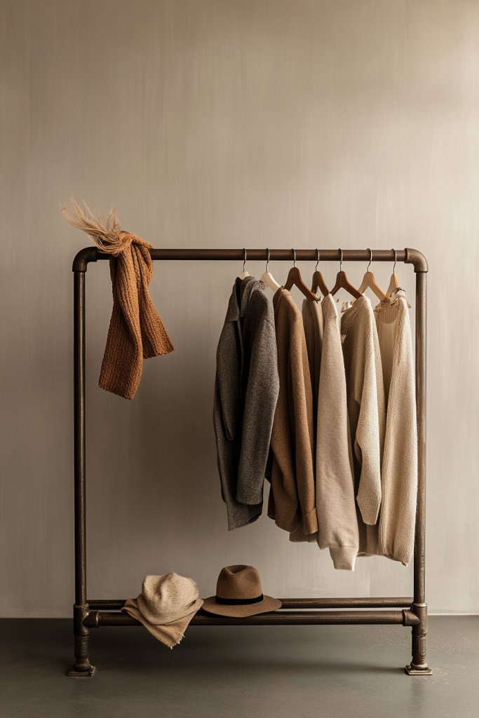 You can customize the pipe rack by adding wooden shelves for shoes or folded items, or even paint the pipes in bold colors for a pop. For smaller rooms, opt for a wall-mounted version to save floor space. During winter, layer with chunky knits or textured fabrics, and in summer, switch to lighter, breezier clothing. You can also incorporate vintage bulbs or industrial hooks to enhance the look.