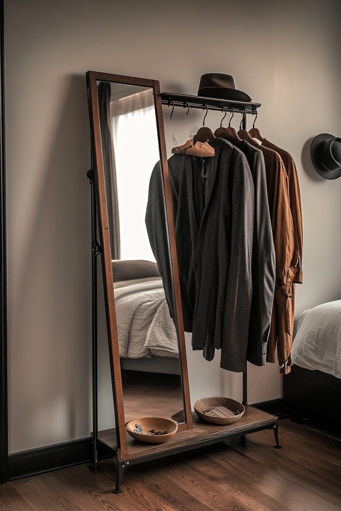 Ever wish your closet could do double duty as a dressing station? An aesthetic clothing rack with an integrated mirror and hooks offers a stylish, functional solution. It’s ideal for small bedrooms or studios, where space is limited but style is non-negotiable. Plus, it streamlines your morning routine by combining essentials into one spot.