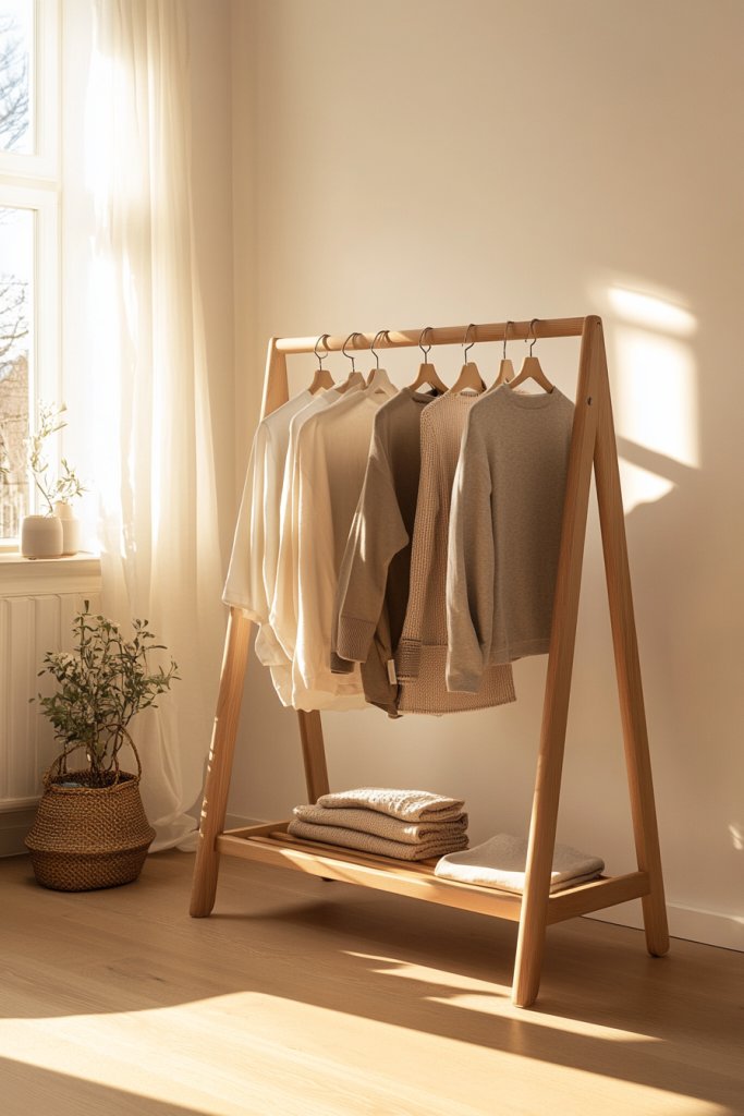 Choose a slim, sturdy frame made of light wood and metal. Assemble according to instructions, ensuring everything is level and secure. Position the rack in a corner or against a wall, leaving enough space for easy access. Use matching or coordinating hangers to maintain the minimalist vibe. Regularly dust and clean the wood to keep it looking fresh. You can also add a small, matching storage box or basket nearby.