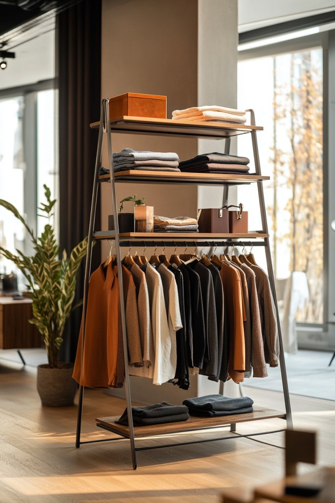 Opt for light oak, ash, or birch finishes to keep the look fresh and airy. Keep the design open and minimal, or add a small, matching shelf above for accessories or folded items. This rack works well in neutral, pastel, or monochrome color schemes. For seasonal updates, swap out the clothes to reflect the changing weather or style trends.