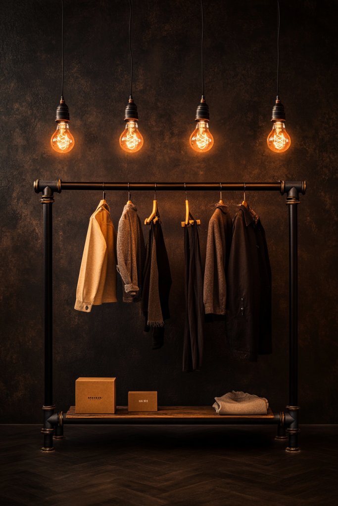 Imagine sturdy black metal pipes forming a robust frame, with hanging bars for your clothes. Overhead, vintage Edison bulbs hang from thick cords, casting a soft amber glow. The combination of raw metal, warm lighting, and well-organized clothes creates a cozy yet edgy vibe. The exposed hardware and filament bulbs add character, making your wardrobe a focal point rather than just storage.