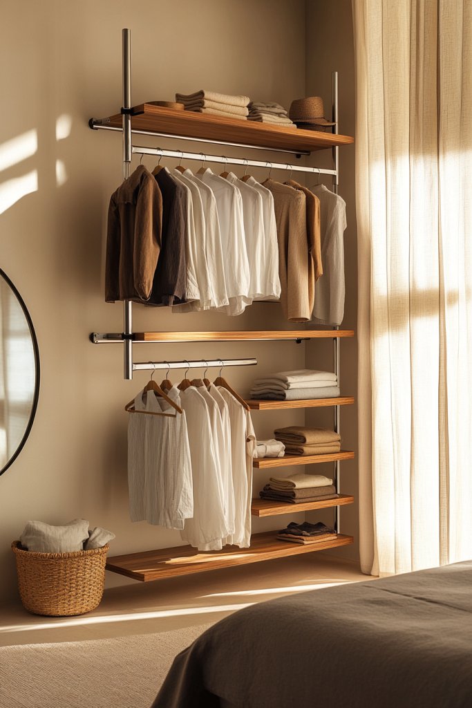 Adjust the heights of each rack based on your clothing lengths and room dimensions. For a more urban vibe, opt for sleek metal or black finishes, or go for warm wood for a cozy feel. Use the upper level for special occasion outfits or seasonal clothing, and keep everyday wear on the lower. You can also add small hooks or baskets underneath for additional storage. This system works well in walk-in closets or open bedrooms.