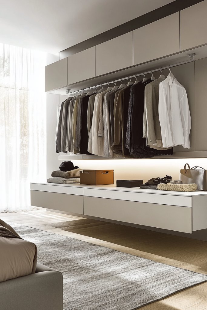 2. Minimalist Floating Clothing Rack with Hidden Storage