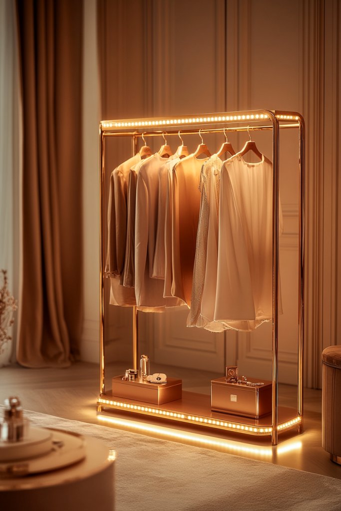 Ever wanted to turn your closet into a luxurious dressing area? A gold-finished clothing rack with LED lighting can elevate your space from basic to glamorous. It’s perfect for fashion lovers who want their outfits to shine and their room to feel like a high-end boutique. Plus, the lighting adds a practical touch for dressing and styling.