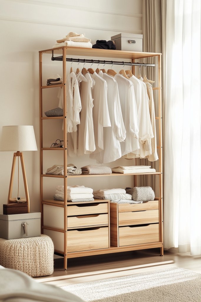 Imagine a sturdy frame with a hanging bar at the top, complemented by open shelves on one side and drawers below. Clothes hang freely on matching hangers, while folded items like sweaters or jeans sit neatly on the shelves. Drawers hold smaller accessories or undergarments, keeping everything out of sight. The mix of open and closed storage creates a balanced, functional workspace that’s also visually pleasing.