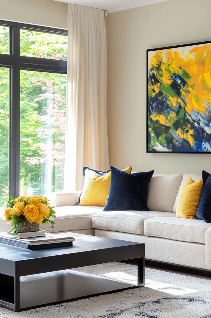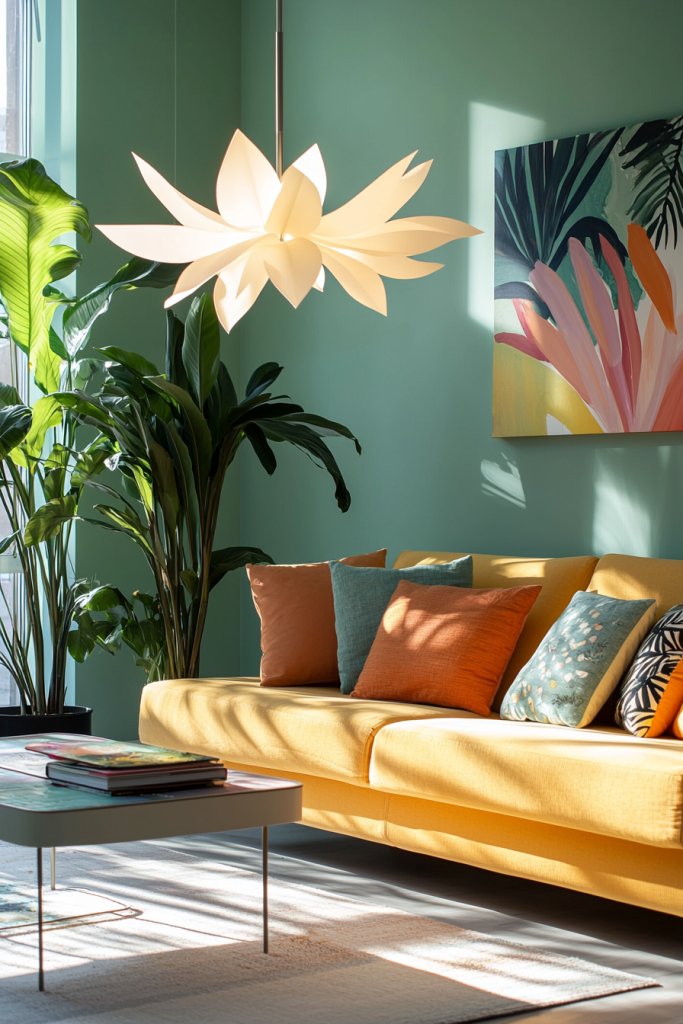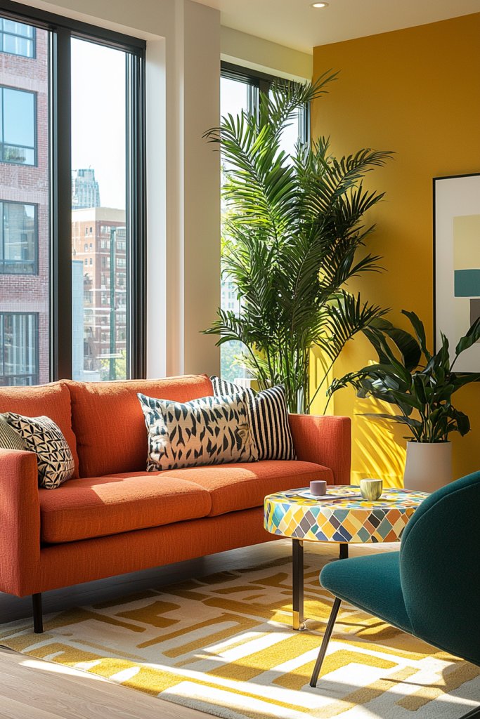 • Feature bright furniture pieces, like a striking sofa or cheerful coffee table, to serve as focal points in the room.