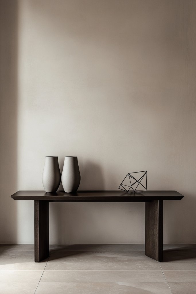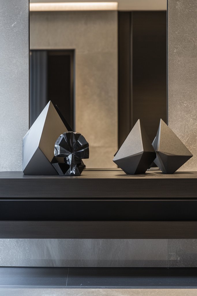 Picture a console with a set of angular, sculptural decor pieces—like geometric vases, sculptures, or wall art (avoiding wall art if you prefer minimalism). Play with triangles, hexagons, or asymmetrical shapes in metal, ceramic, or acrylic. Pair these with sleek furniture and monochrome or bold color schemes for a striking effect. The overall vibe is contemporary and artistic, with a hint of playfulness.