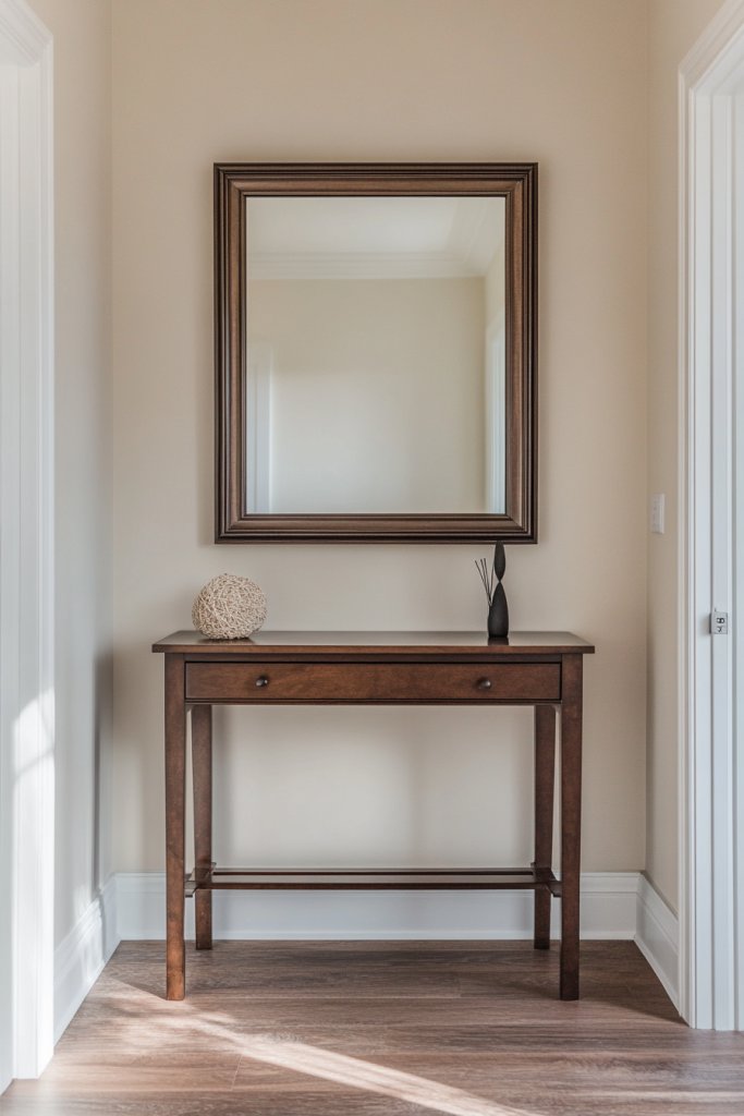 Picture a large, decorative mirror hung above your console, reflecting the opposite wall or window. The mirror’s frame complements your decor style—be it ornate, minimalist, or rustic. Light from nearby fixtures or natural sources bounces off its surface, illuminating the space. The effect is a spacious, airy feel that energizes the entryway.