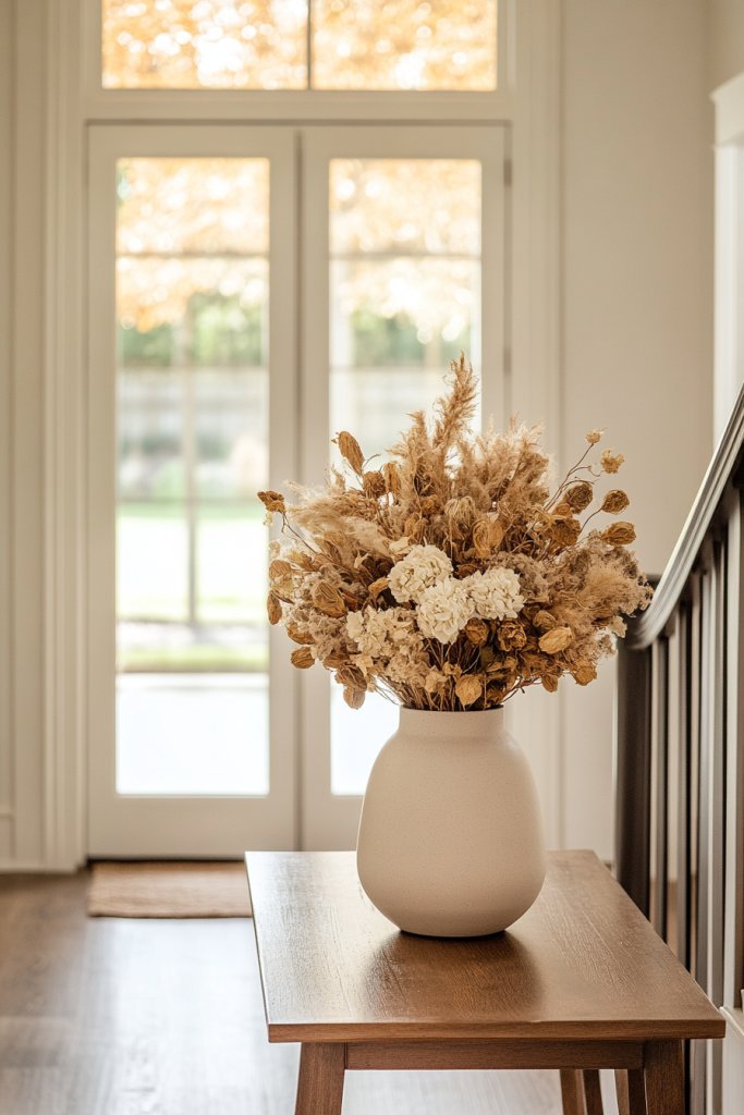 Hate the hassle of caring for real plants but love the look of greenery? Faux or dried arrangements offer a fuss-free way to add natural beauty to your entryway. They bring texture and life without the ongoing maintenance. If you want a fresh, inviting vibe without the green thumb, this idea is perfect.
