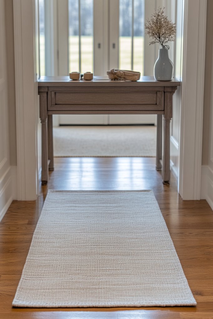 Imagine a plush, textured runner in a neutral hue leading from the door to your console. The tactile surface adds depth and softness, contrasting with sleek furniture or hard flooring. Patterns like geometric, braided, or shaggy textures introduce visual interest while anchoring the space. The overall effect is warm, inviting, and layered, encouraging guests to relax immediately.