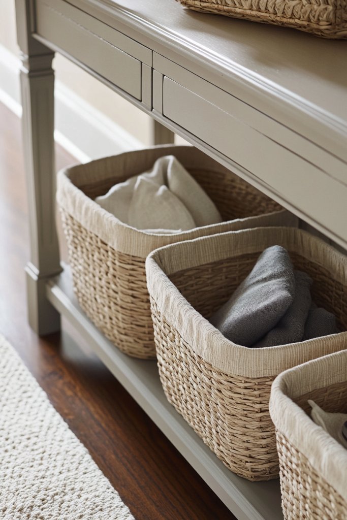 Select baskets that match your decor and are appropriately sized for your needs. Place them under the console, on shelves, or on the floor, depending on your layout. Use them to hide shoes, umbrellas, or miscellaneous items. Incorporate labels for easy identification and encourage household members to keep things tidy. Regularly declutter and switch out seasonal liners or covers.