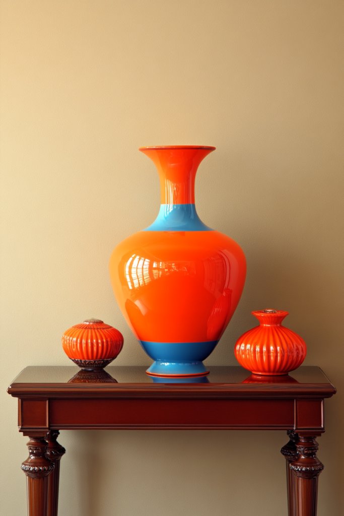 Envision a sleek console with a tall, vivid turquoise vase filled with fresh flowers or dried grasses. Bright bowls in fiery reds or sunny yellows sit next to sculptural decor in bold hues. The contrast against neutral walls or furniture makes these colors pop, creating a lively, dynamic visual. Textured ceramics or matte finishes add depth, while the overall vibe remains playful and energetic.
