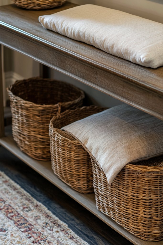 Imagine a row of woven baskets in natural tones lining the bottom of your console, holding shoes, umbrellas, or scarves. The textures add warmth and visual interest, softening the overall look. Decorative baskets with leather handles or colorful patterns can also serve as statement pieces. The result is a space that’s functional yet inviting, with everything neatly tucked away.