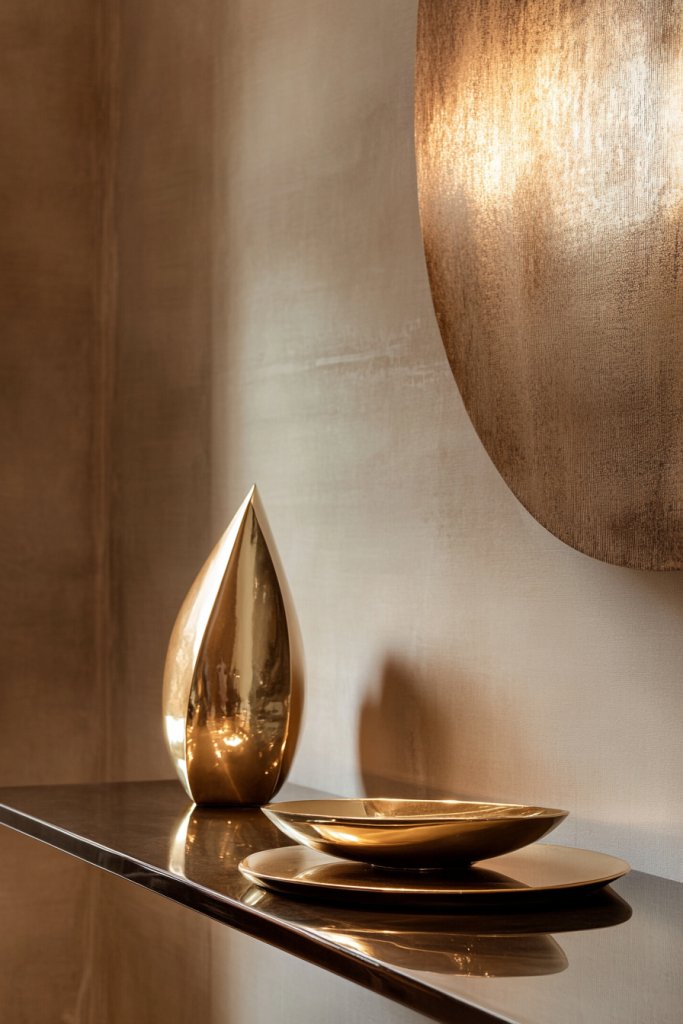 Picture a sleek console topped with a gold-trimmed tray holding small decorative objects, like a textured box or a sculptural piece. Brass or gold-toned fixtures, such as hooks or handles, catch the light and add warmth. The reflective surfaces bounce ambient light around, creating a luminous glow. The overall look is sophisticated but approachable, with a hint of opulence that doesn’t feel pretentious.