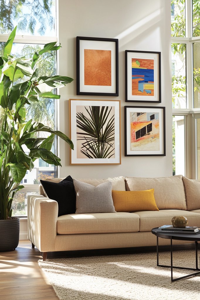 Consider using different frame styles and colors for a dynamic look, or keep it cohesive with uniform frames for a polished feel. Arrange your pieces on the floor first to find the perfect layout before committing to the wall.
