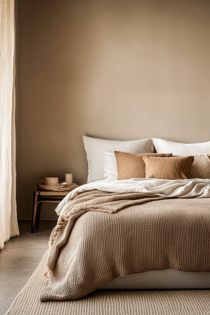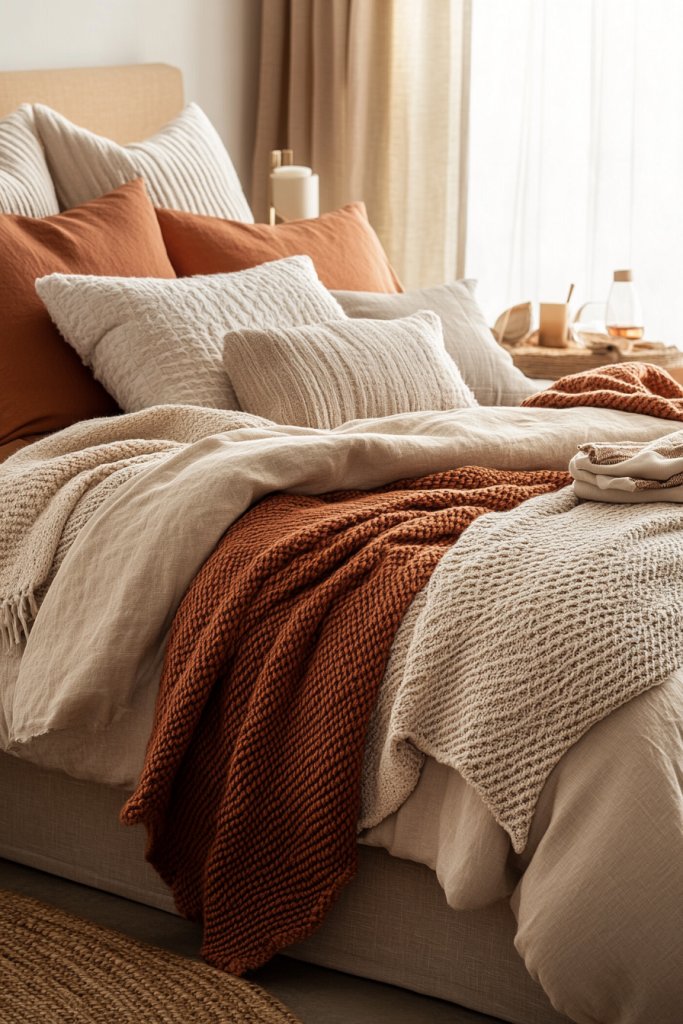 1. Layered Textured Bedding with Earth Tones for a Cozy Atmosphere