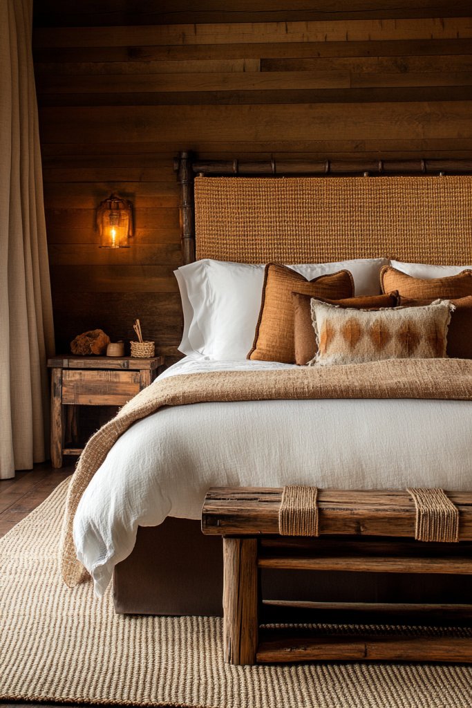 Picture a weathered wooden bench at the foot of your bed, topped with a textured throw and a few stacked books. Or imagine bamboo wall shelves holding simple baskets or decor objects, adding layers of visual interest. The warm tones and natural grain of wood or bamboo soften the room’s overall aesthetic, creating a tactile and visual warmth. These accents evoke a rustic, boho, or coastal vibe, making your bedroom feel like a retreat.