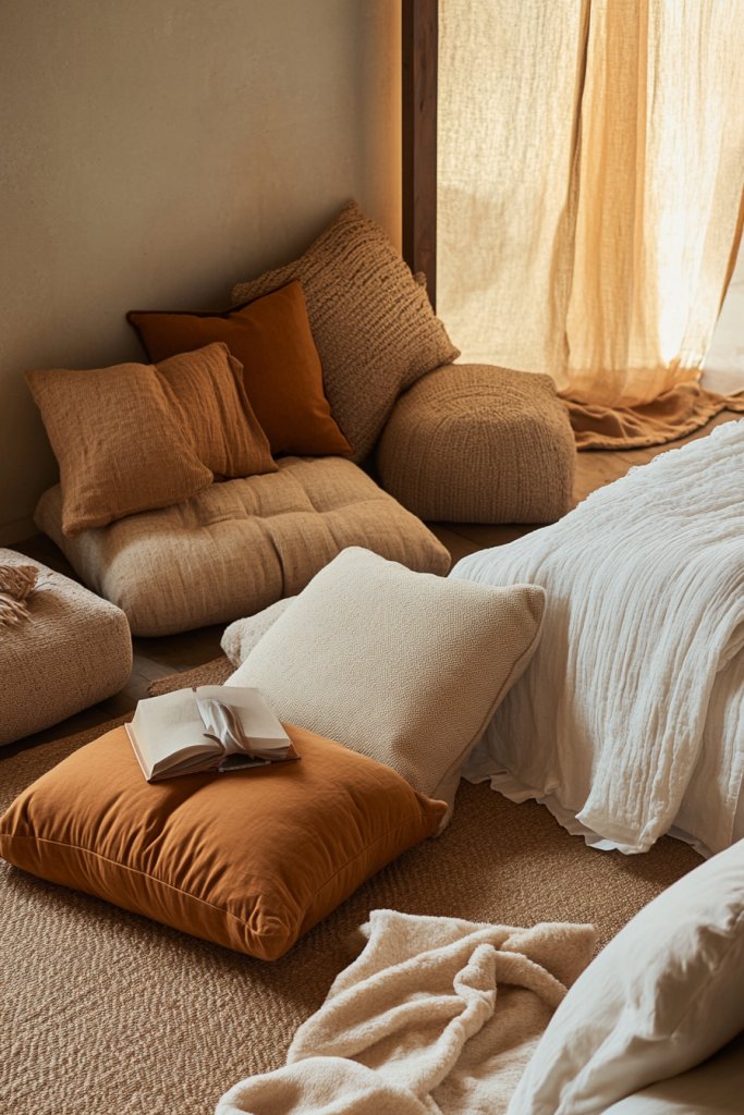 Visualize a corner of your room with a plush, oversized floor cushion in a warm, textured fabric. Surround it with smaller poufs in coordinating earthy tones, creating an inviting, layered seating area. Add a soft throw blanket and a small side table or a basket nearby for books or snacks. The space feels intimate and relaxed, perfect for lounging or meditating. Natural light floods in through sheer curtains, highlighting the textured fabrics and making the nook irresistibly cozy.