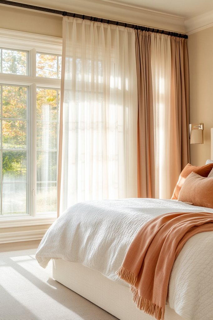 Picture a window dressed with lightweight, sheer linen curtains in a neutral tone, layered behind heavier, textured blackout drapes in warm beige. When open, the sheer panels diffuse sunlight softly, creating a warm glow. When closed, the blackout curtains block out light and noise, turning your space into a restful sanctuary. The layered look adds visual interest, with the textures and colors complementing your bedding and textiles. It’s both functional and beautiful, creating a sophisticated boho aesthetic.