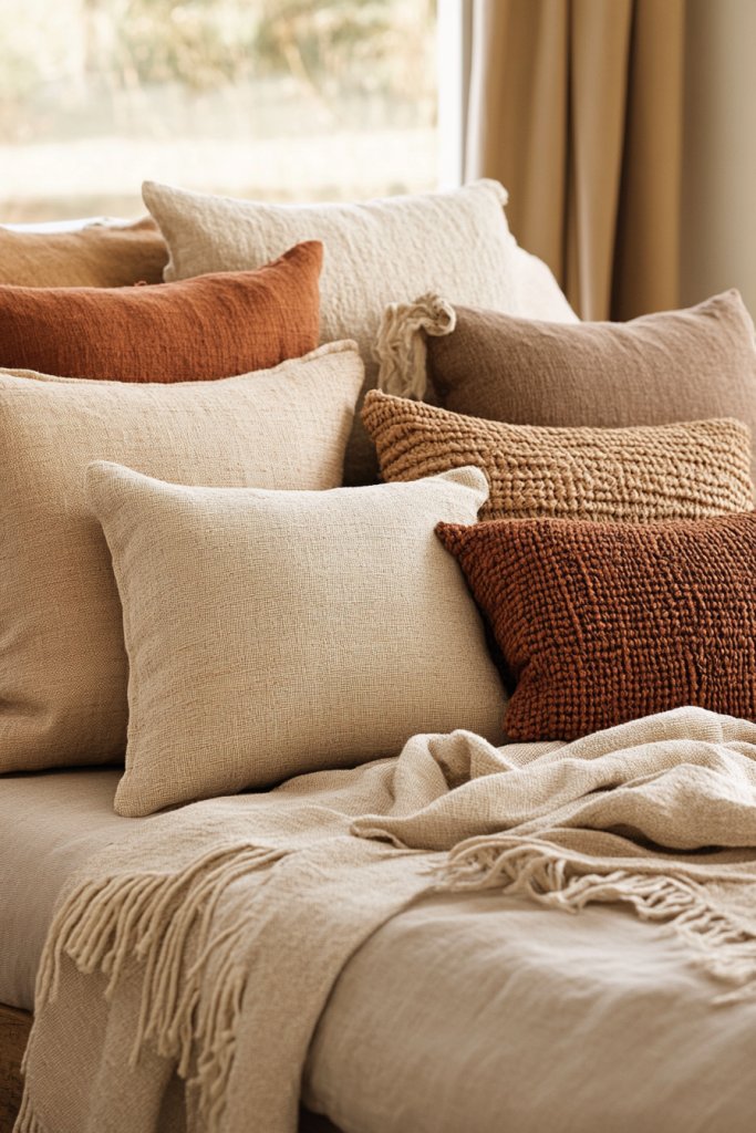 Mix different textures—knit, woven, embroidered—for visual interest. Use pillows in various sizes and shapes to create a layered, cozy effect. Stick to neutral tones for a calm, understated look or add a few with subtle earth-tone patterns for variety. Swap covers seasonally or when you want a fresh vibe. Keep the overall palette warm and natural for maximum comfort.
