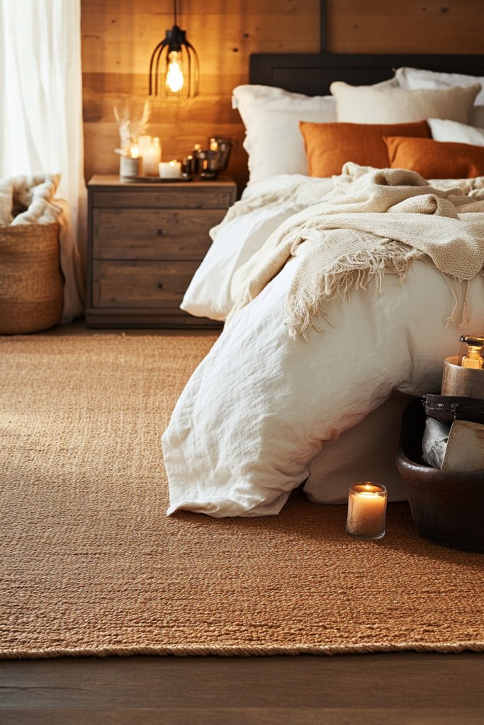 Imagine walking barefoot onto a lush jute or sisal rug in a warm, sandy hue that complements your bedding. The textured fibers add visual interest and tactile warmth, contrasting beautifully with smooth wooden floors or tiles. Layered with textiles like throws or cushions, the rug anchors your bed or seating area, creating a cohesive, cozy zone. The natural tones and rough textures evoke a boho, coastal, or rustic vibe, transforming your bedroom into a calming retreat.