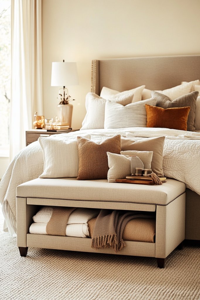 Picture a plush, beige fabric ottoman at the foot of your bed, with a lid that lifts to reveal storage inside. It acts as both a seat and a hidden compartment for extra linens or seasonal items. Its soft, textured fabric complements layered bedding and woven accents, creating a harmonious, cozy vibe. The neutral hue blends seamlessly with your decor, making the space feel calm and organized. It’s a practical yet beautiful addition that enhances your bedroom’s warmth.