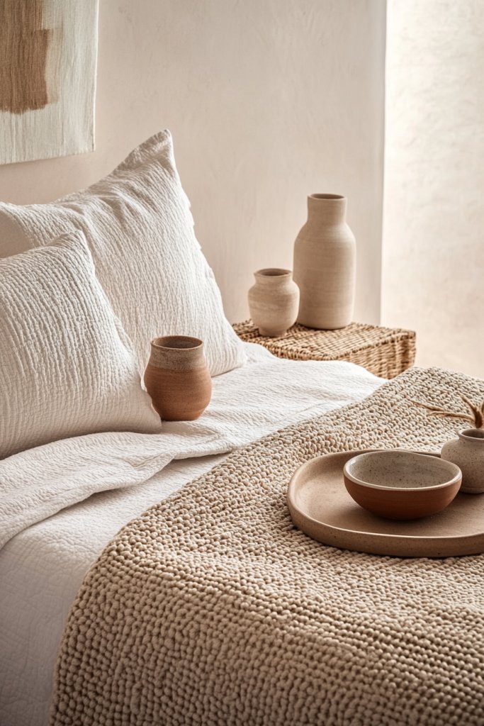 Imagine a bed dressed in a variety of fabrics—think a soft cream throw blanket with chunky knit texture, a woven beige coverlet, and a medley of pillows in warm taupe, sandy beige, and muted terracotta. The different textures create depth and tactile interest, making the bed look irresistibly cozy. Add in a few embroidered or fringed cushions, and suddenly your bedroom looks like a restful retreat straight out of a boho magazine. Warm, natural light enhances these earthy tones, making everything feel even more inviting.