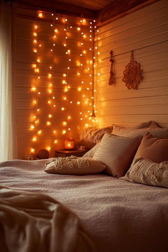 Imagine a ceiling adorned with warm-toned LED string lights arranged in a gentle wave or draped along a wall. The soft glow casts a cozy amber hue, transforming the room into a haven of tranquility. Alternatively, lantern-style lamps with fabric shades sit on bedside tables, emitting a warm, diffuse light that softens shadows. These lighting choices create a layered, intimate environment perfect for reading or unwinding. The overall effect is a bedroom that feels warm, welcoming, and totally Instagram-worthy.