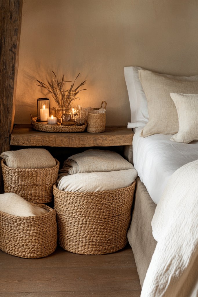 Struggling with clutter that makes your bedroom feel chaotic instead of cozy? Woven baskets are the perfect solution to keep things tidy while adding a touch of natural charm. They’re versatile enough to store everything from blankets to shoes, and their handcrafted look instantly warms up any space. Who says storage has to be boring?