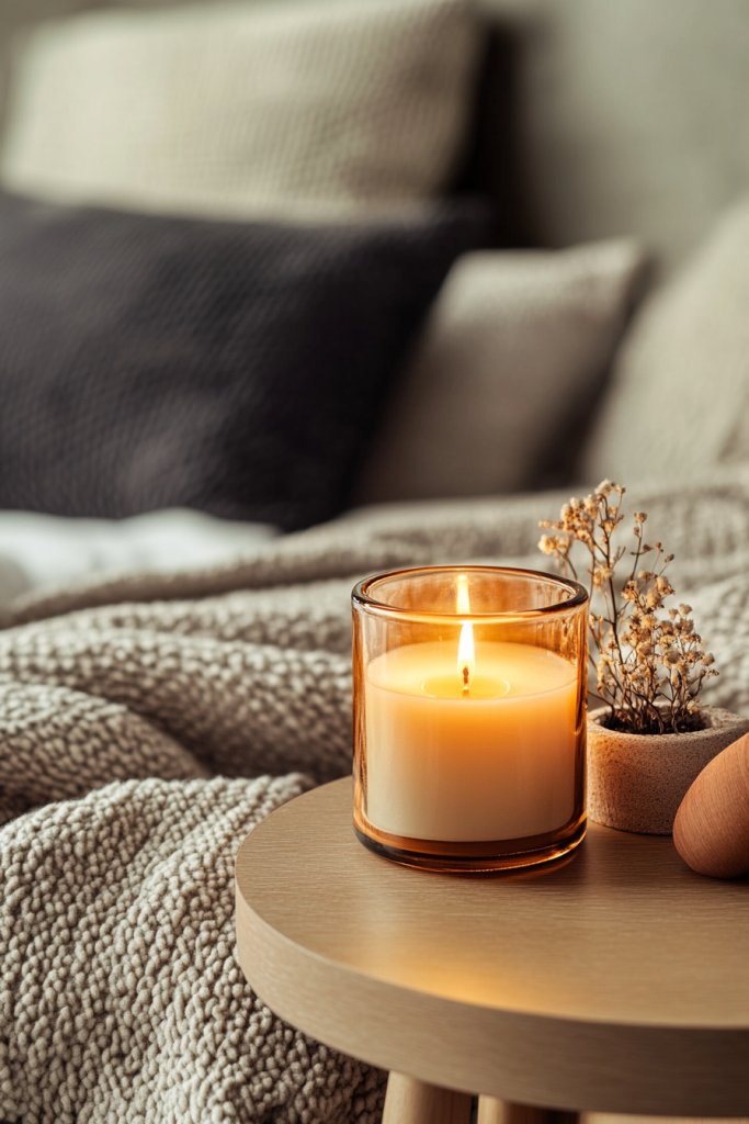 Imagine a set of rustic metal or ceramic candle holders on your bedside table, each holding a softly flickering unscented candle. The warm glow casts gentle shadows across textured walls and layered textiles, inviting you to relax. Or picture a cluster of small votives arranged on a tray or shelf, creating a cozy nook. The flickering light dances in harmony with the textured bedding and woven accents, transforming the room into a peaceful retreat. It’s the kind of ambiance that makes you want to stay in bed all day.