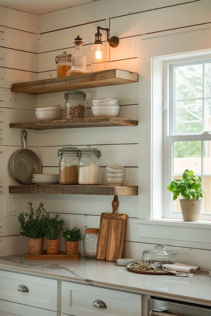 To maintain a clean look, keep your shelves organized and decluttered. Open shelving not only elevates your kitchen’s aesthetic but also encourages you to embrace your unique culinary story, transforming the space into a heartwarming gathering spot.