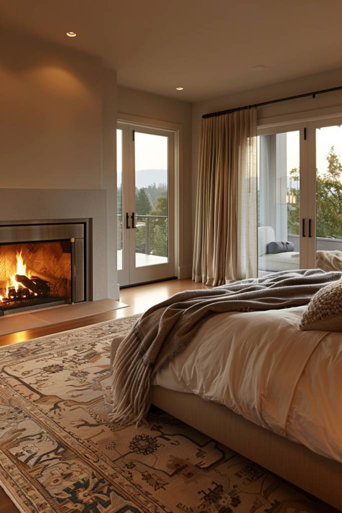 Don’t forget to incorporate soft lighting to complement the fire’s glow, enhancing the room’s intimate ambiance. With a fireplace, your master bedroom becomes more than just a place to sleep; it evolves into a comforting haven that invites relaxation and peace.