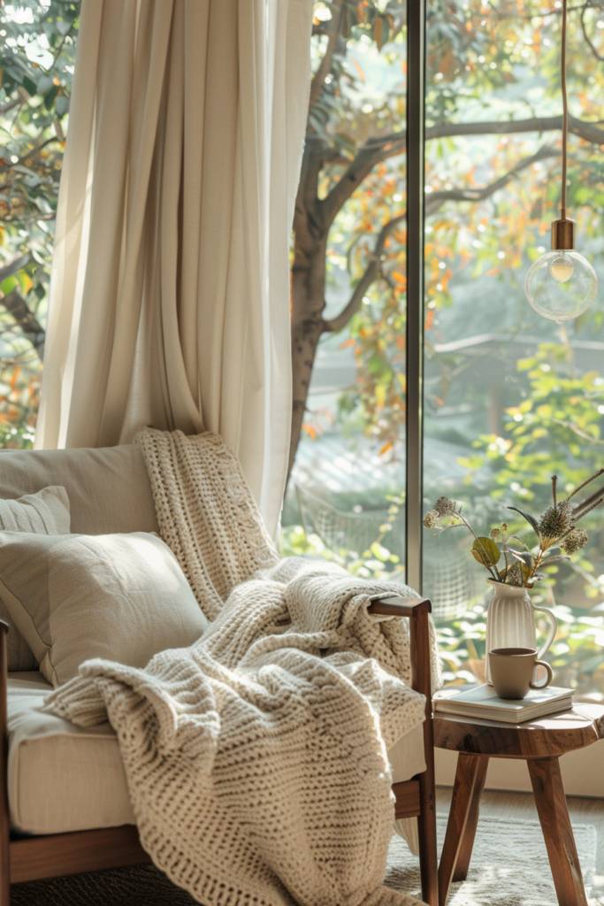 To enhance the ambiance, consider adding a delicate floor lamp or string lights, casting a warm, inviting glow. Surround yourself with greenery—succulents or potted plants can breathe life into your corner while promoting tranquility.