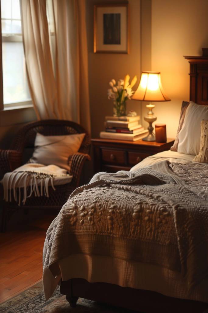 After you’ve crafted a serene sleeping environment with quality bedding, it’s time to enhance your master bedroom further by creating a cozy reading nook. Envision this: a snug corner bathed in soft, ambient light, inviting you to unwind with a good book. Start by selecting a comfortable chair or plush bean bag that cradles you in relaxation. Layer it with soft throw pillows and a warm blanket for that extra touch of coziness.