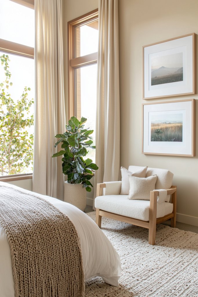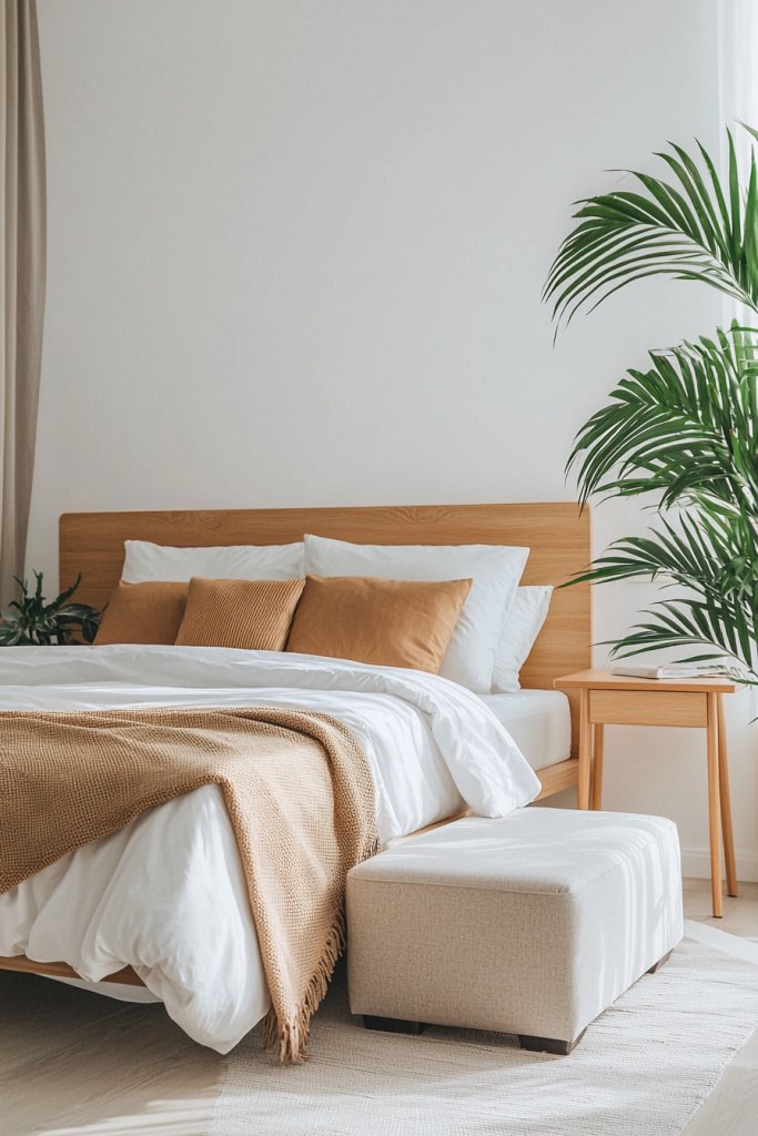 Pair light wood furniture with plush cream bedding, and let natural light dance off of soft, earthy accents. Add a pop of personality with greenery or a striking piece of art that complements the palette without overwhelming it.