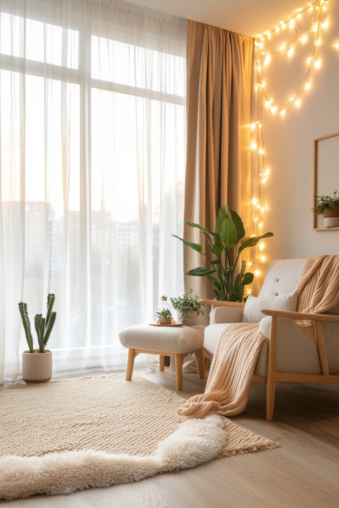 Incorporate natural elements with wooden furniture and low-maintenance plants to breathe life into your space. Create a serene reading nook with plush seating and soft lighting for that inviting glow.