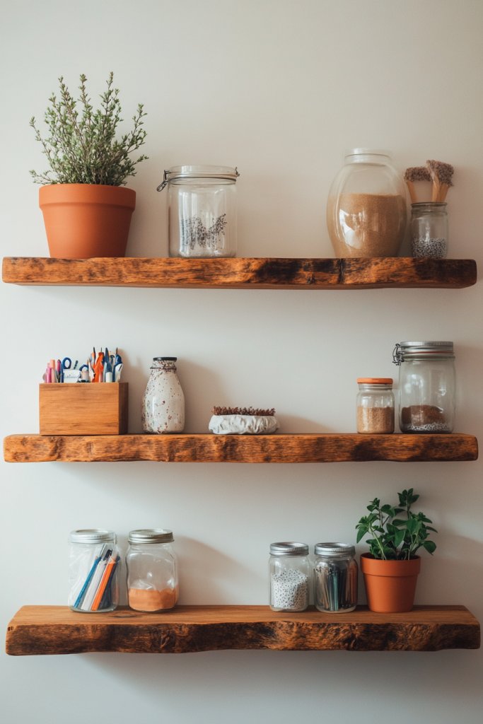 Visualize a set of sturdy, weathered wood planks mounted flush against the wall, holding jars, small baskets, or decorative items. The natural imperfections and grain add character, making your room feel warm and inviting. Arranged symmetrically or asymmetrically, these shelves become a focal point that showcases your favorite supplies or decor pieces. They’re functional art that elevates your entire workspace.