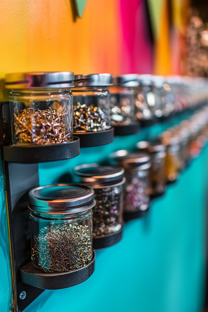Purchase magnetic spice jars and a sturdy metal or magnetic board from kitchen or hardware stores. Clean jars thoroughly and decorate lids if desired. Mount the board securely on the wall using screws or adhesive strips. Fill jars with metallic supplies, then attach them magnetically. Organize by project, color, or size to streamline your workflow. Regularly check and refill to keep everything tidy and accessible.
