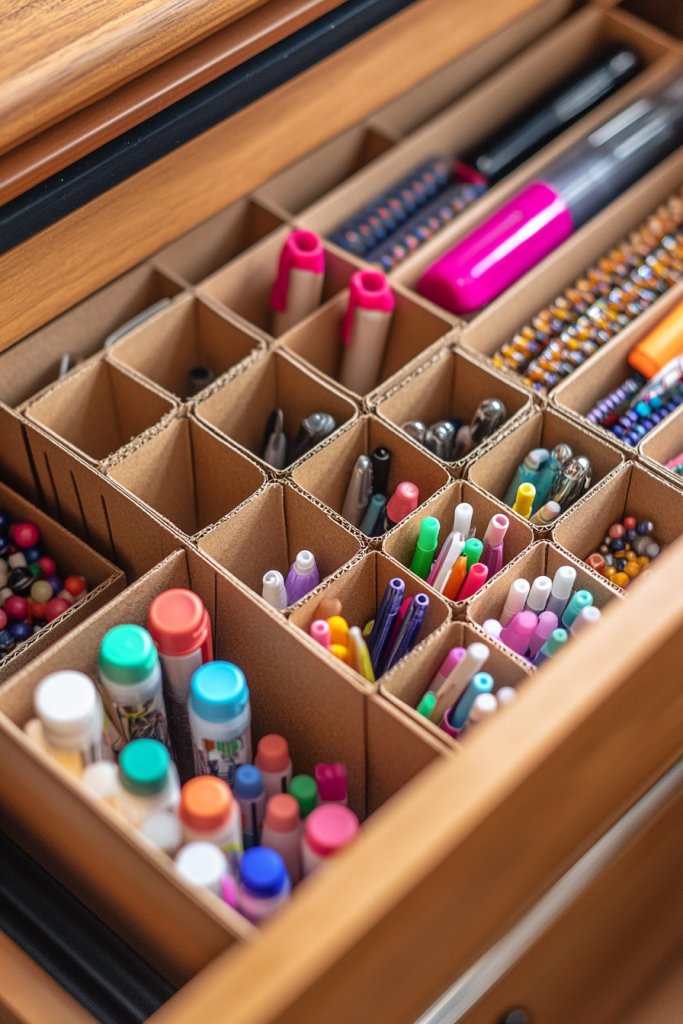 Picture a cluttered drawer suddenly transformed by neatly inserted dividers, creating separate sections for beads, scissors, and brushes. Using repurposed cardboard, foam board, or old plastic containers, you can customize the compartments to fit your needs. The result is a tidy, accessible space that invites you to create without hunting through clutter. It’s a simple fix with a big impact.