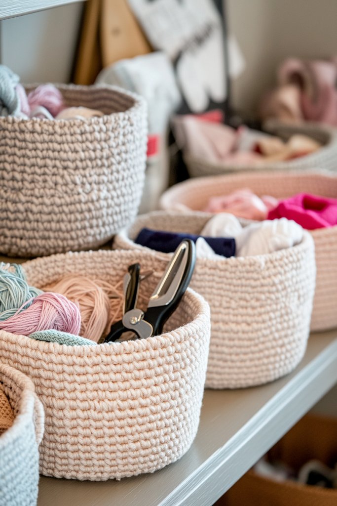 Envision a collection of hand-crocheted baskets in earthy tones or vibrant colors, sitting on shelves or under tables. The soft edges and textured surfaces create a welcoming vibe. Some baskets feature decorative handles or trims, adding a personalized touch. They hold everything from yarn balls to fabric pieces, making your supplies look intentionally curated rather than chaotic. It’s both functional and decorative.