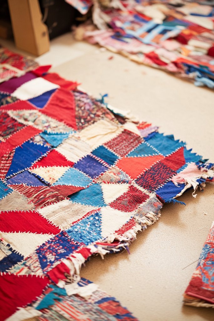 Picture a patchwork of colorful fabric scraps arranged in a vibrant mosaic on your floor. Some pieces painted with geometric patterns or abstract designs, others left plain or distressed. The textures and colors create a lively foundation that energizes your entire workspace. It’s a handcrafted statement piece that invites you to sit down and create.
