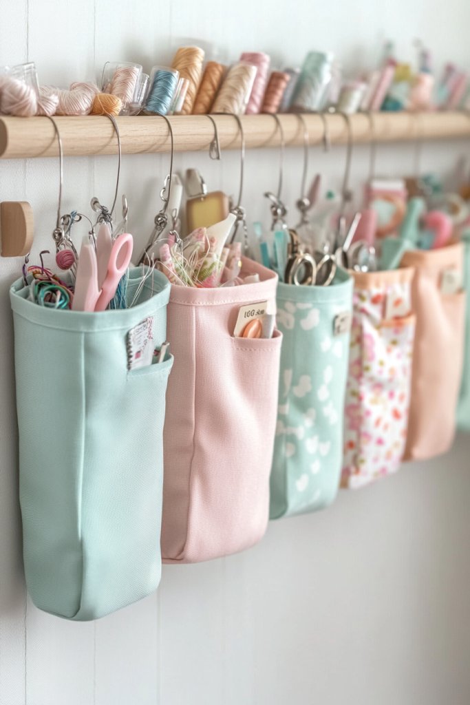 Imagine a wall with colorful fabric or plastic pockets hung in rows or clusters. Each pouch holds different tools or supplies—scissors, glue sticks, or ribbons—visible and accessible. The vibrant colors and varied sizes create a lively, functional art installation. It’s a practical way to keep your essentials front and center, inspiring spontaneous creativity.