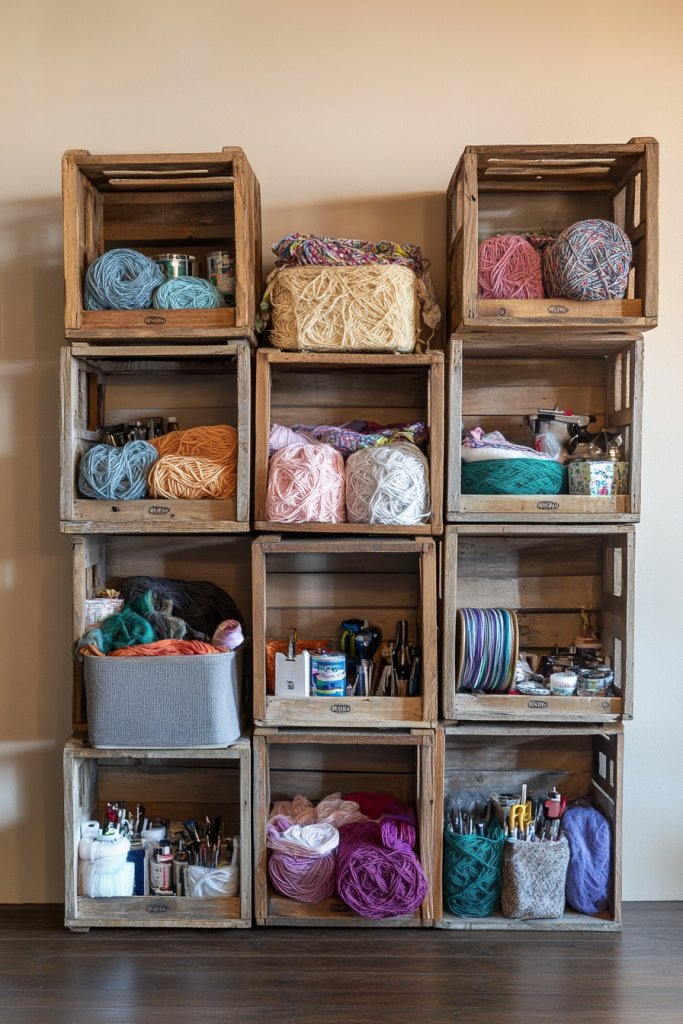 Arrange crates in different configurations—stacked vertically, side-by-side, or in a zig-zag pattern—for maximum flexibility. Paint or stain them to match your room’s palette or leave them natural for a rustic feel. Add casters for mobility or attach hooks for hanging tools. Use smaller crates for jewelry or bead storage, and larger ones for fabric or paper stacks. This modular approach adapts easily to any space or style.